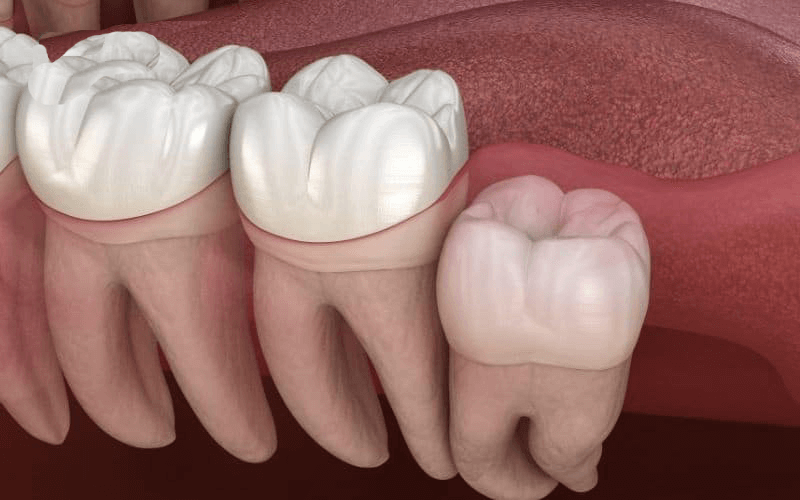 Mọc kẹt bán phần trong nướu: Một phần thân răng lộ ra nhưng bị mô nướu bao phủ (lợi trùm), tạo túi nướu chứa mảng bám vi khuẩn gây viêm lợi trùm cấp tính.